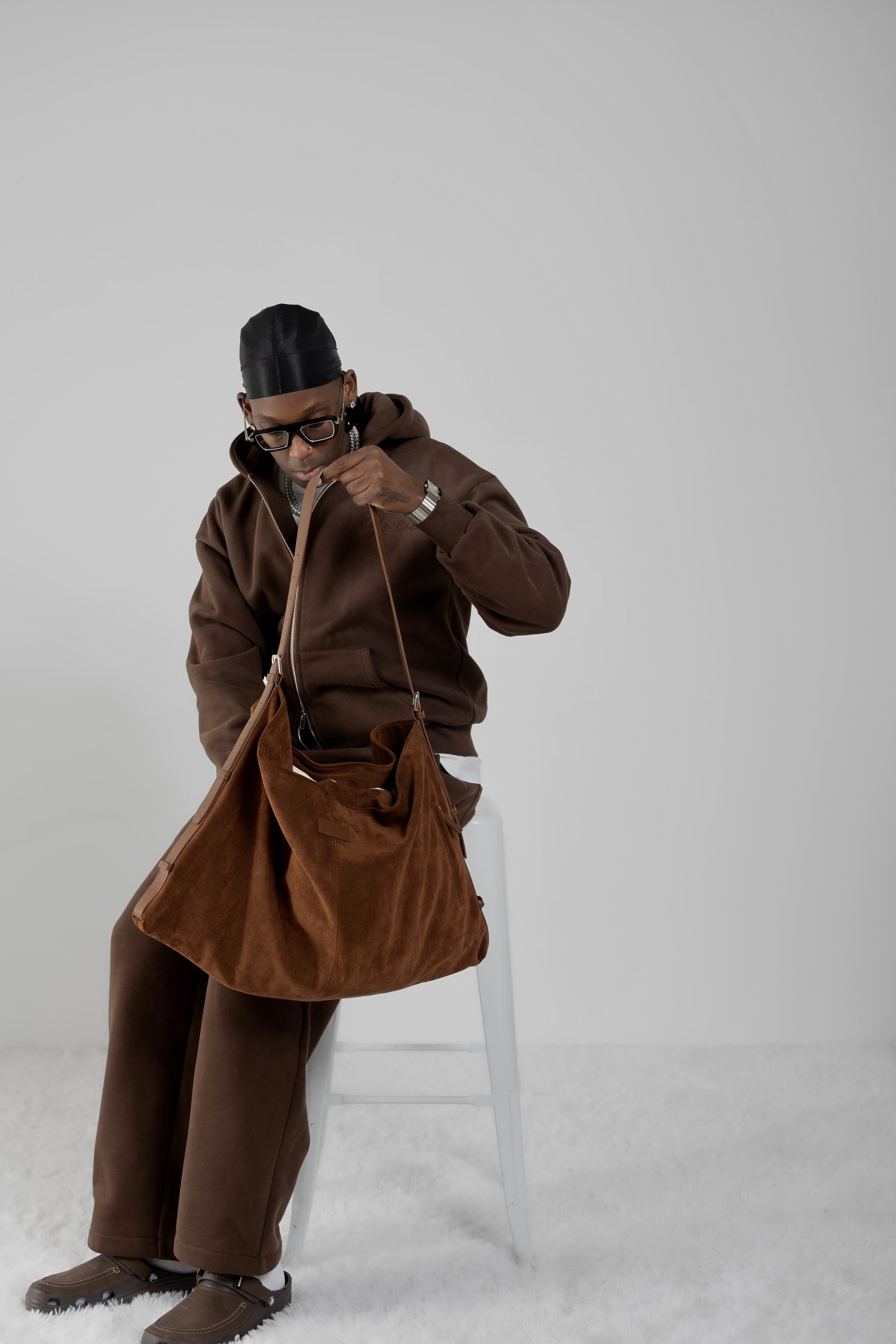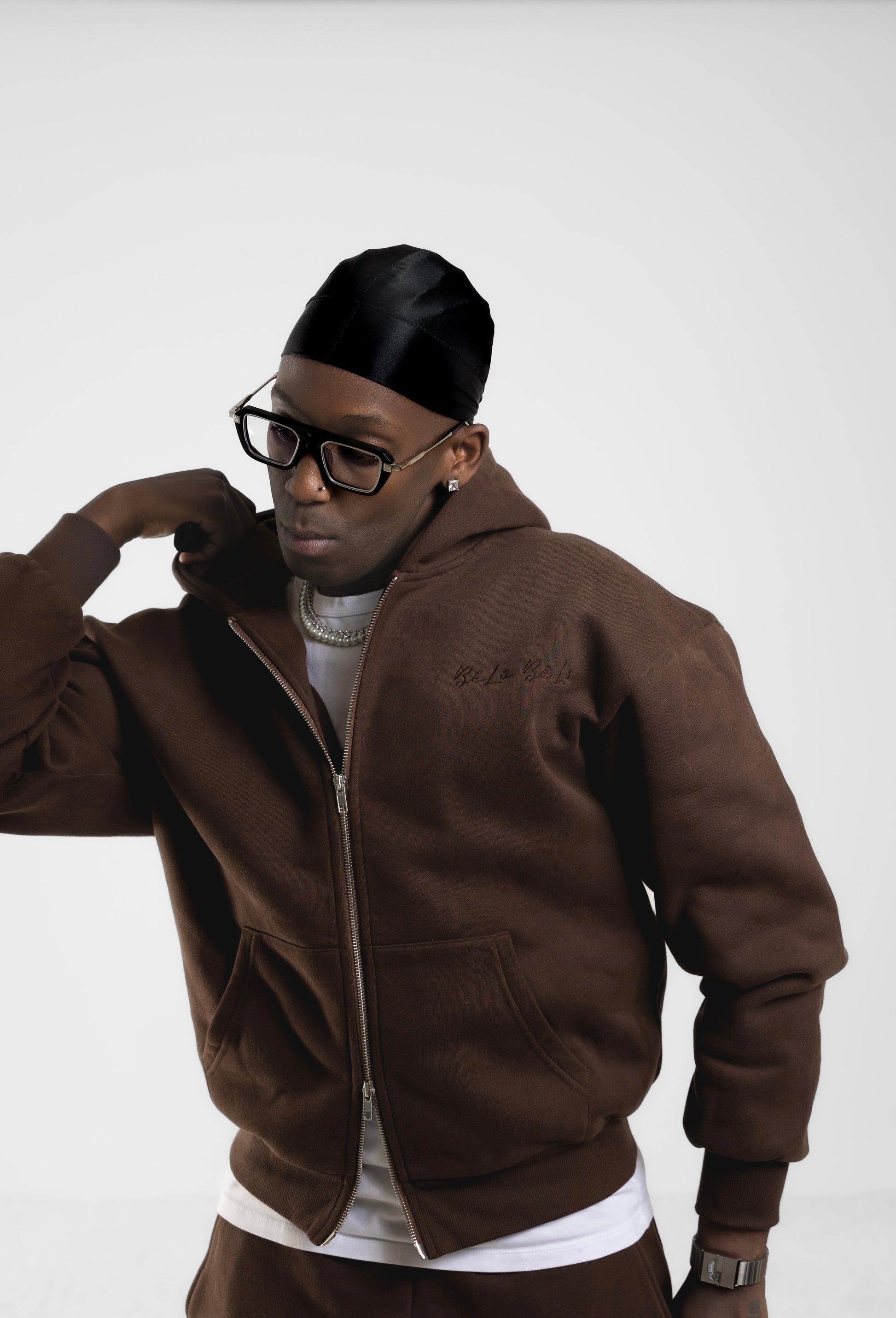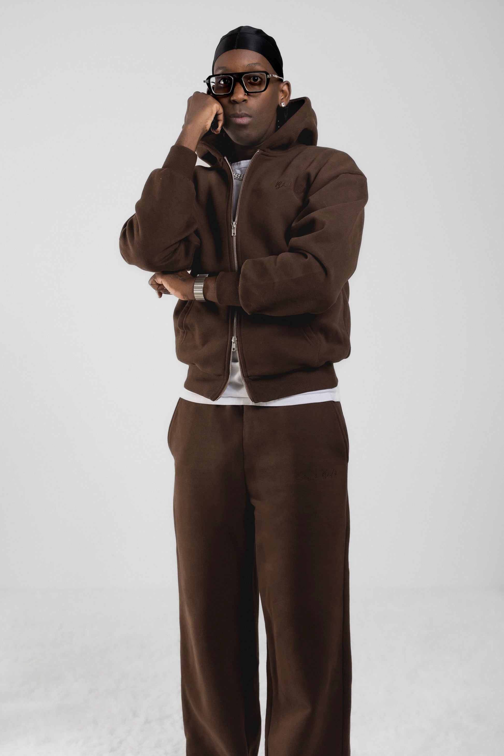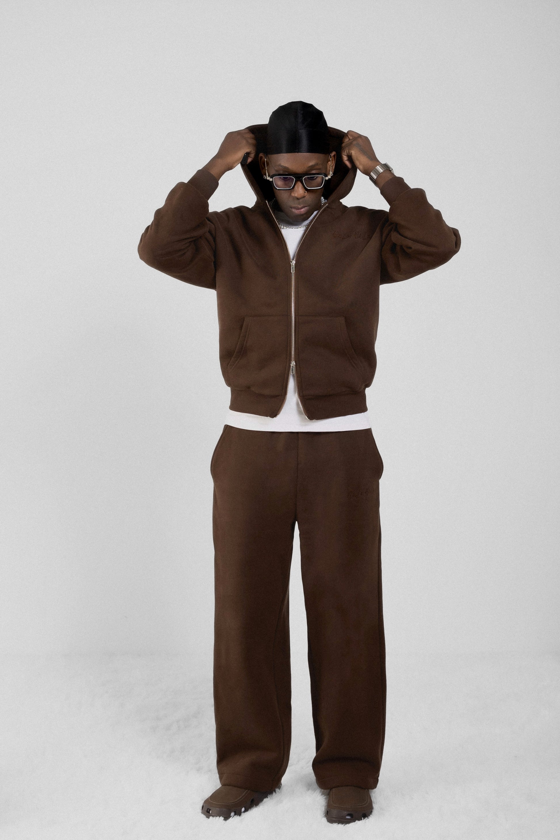 - The zip-up hoodie and straight-leg trousers are finished with subtle detailing and a restrained aesthetic, creating a look that is understated, intentional, and timeless.