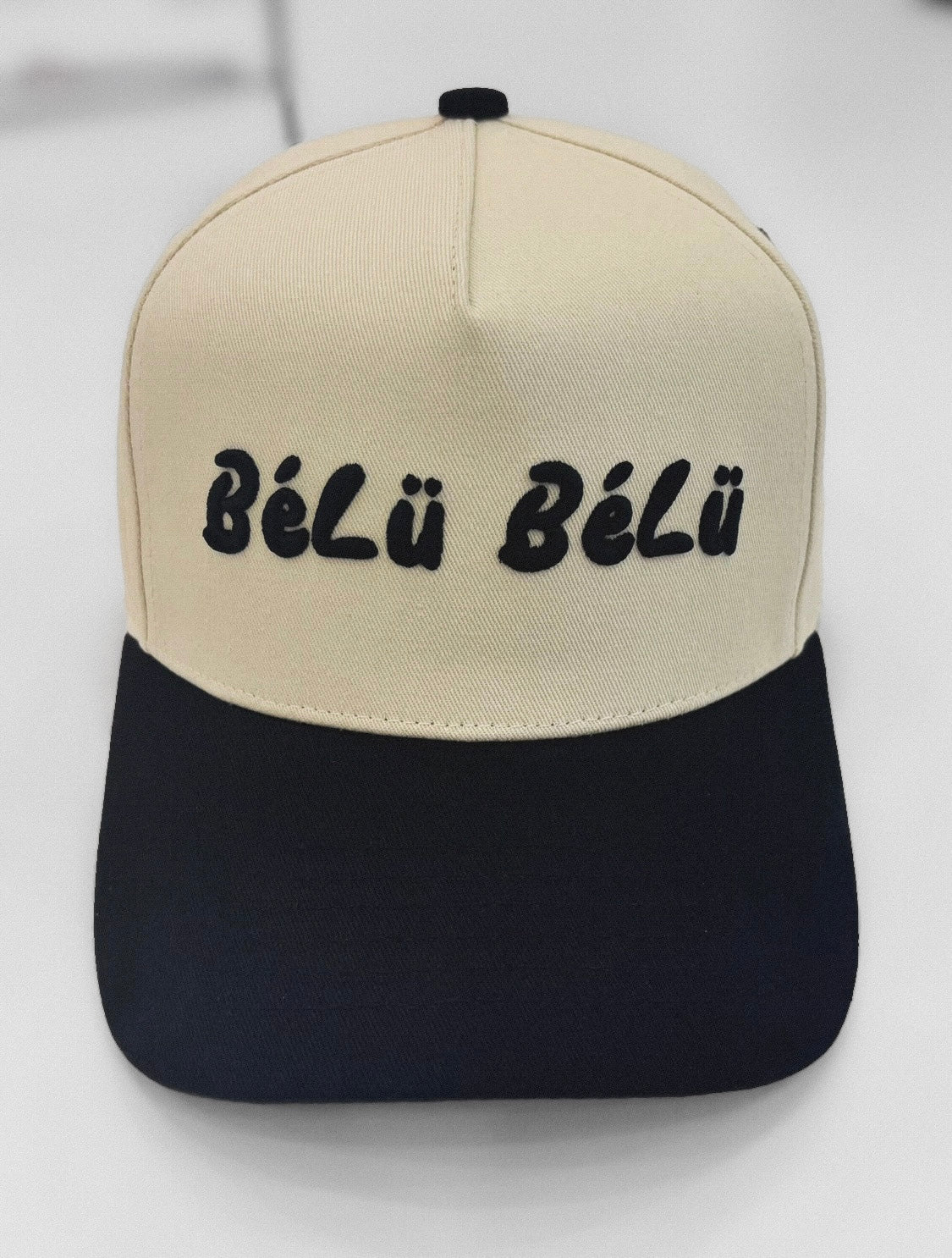 The BéLü Original – Onyx Snapback Hat pairs a matte beige crown with a deep black brim, finished with plush embroidered branding